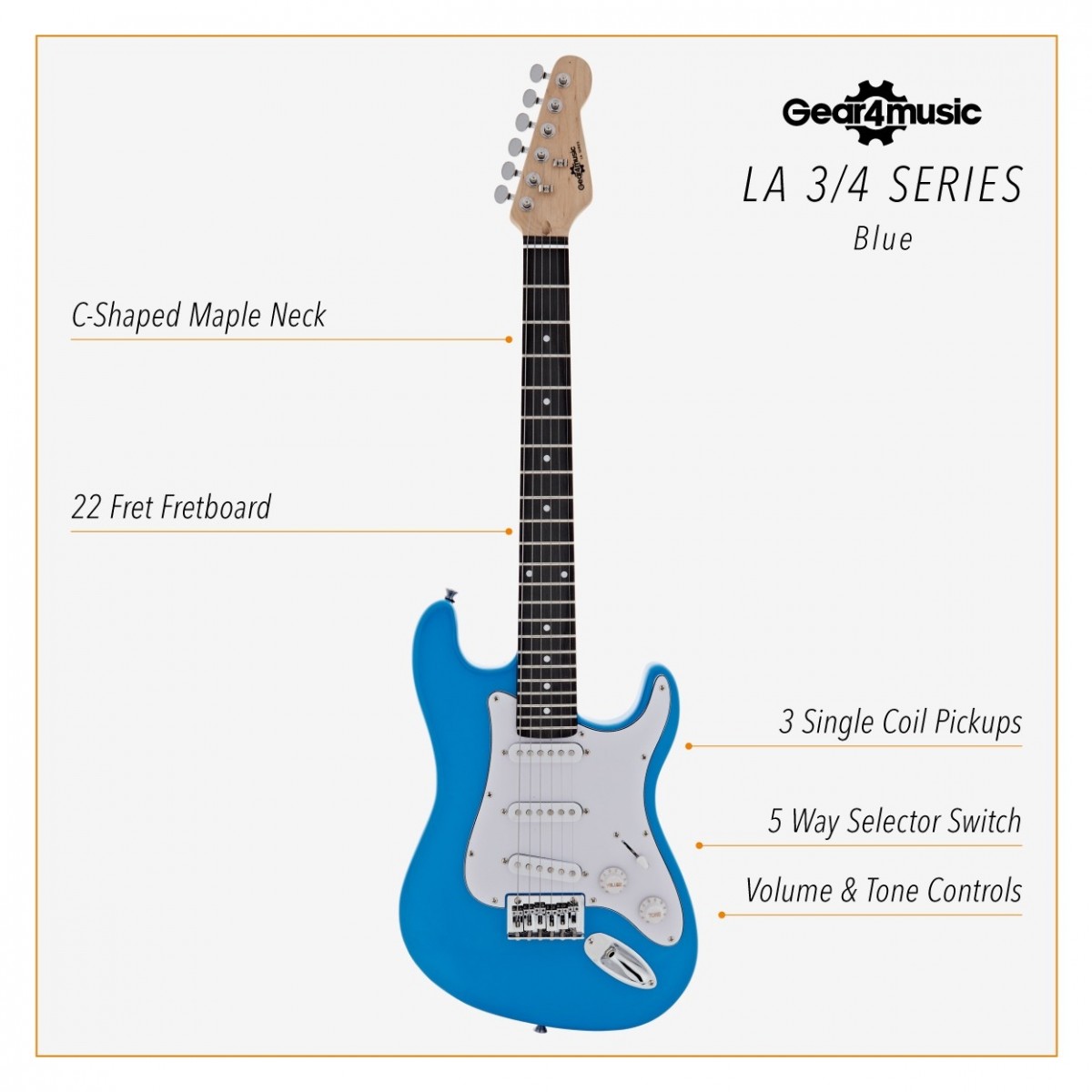 3/4 LA elgitarr med miniförstärkare är ett idealiskt paket för att kickstarta en spirande gitarristkarriär. Med en gitarr i 3/4-storlek och en ultraportabel 3 watts förstärkare erbjuder detta paket en användarvänlig plattform som är perfekt för yngre spelare eller för alla som helt enkelt letar efter ett bra startkit. LA-gitarrens konstruktion är avsiktligt lätt och hanterbar med ett reducerat halsdjup och en bredd som är perfekt för yngre musiker. Dessutom i ett försök att göra det så enkelt som möjligt att komma igång levereras LA-gitarrer försträngda och inställda som standard vilket eliminerar behovet av komplexa justeringar – ge den bara en snabb stämning och den är redo att rocka! Denna blå 3/4 LA har tre enstaka-coil-pickuper och en femvägs switch vilket ger ett brett utbud av ljud att utforska med den medföljande mini-förstärkaren och gör LA till ett perfekt val för nya spelare som ännu inte har bestämt sig för en föredragen stil. Dessutom levereras varje LA-gitarr med viktiga tillbehör för att maximera spelupplevelsen inklusive en kabel för anslutning till förstärkaren rem väska och plektrum! Observera: Den medföljande mini-förstärkaren kan variera något från modellen på bilden.