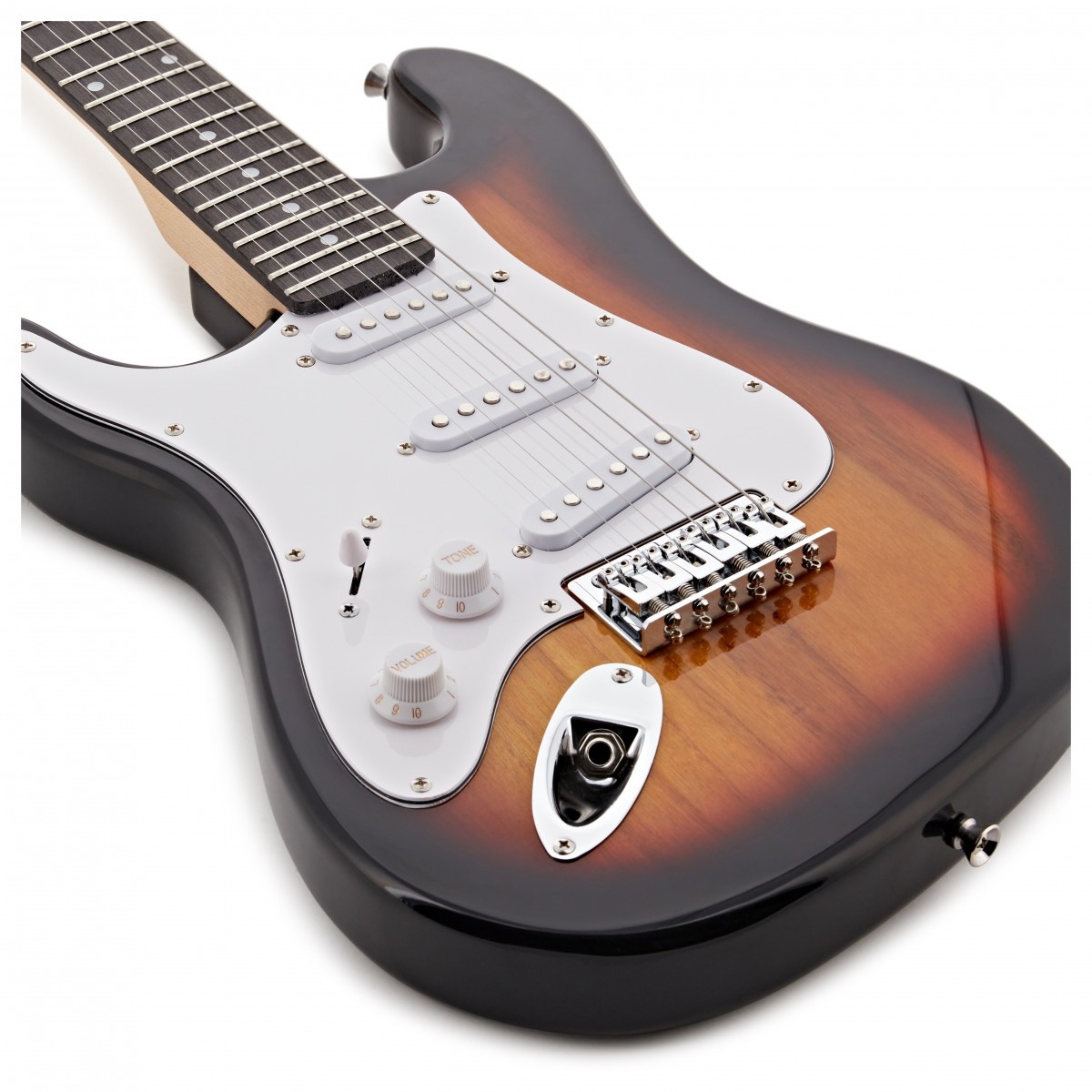 3/4 LA elgitarr med miniförstärkare är ett idealiskt paket för att kickstarta en spirande gitarristkarriär. Med en gitarr i 3/4-storlek och en ultraportabel 3 watts förstärkare erbjuder detta paket en användarvänlig plattform som är perfekt för yngre spelare eller för alla som helt enkelt letar efter ett bra startkit. LA-gitarrens konstruktion är avsiktligt lätt och hanterbar med ett reducerat halsdjup och en bredd som är perfekt för yngre musiker. Dessutom i ett försök att göra det så enkelt som möjligt att komma igång levereras LA-gitarrer försträngda och inställda som standard vilket eliminerar behovet av komplexa justeringar – ge den bara en snabb stämning och den är redo att rocka! Denna sunburst 3/4 LA har tre enkelspoliga pickuper och en femvägs switch vilket ger ett brett utbud av ljud att utforska med den medföljande mini-förstärkaren och gör LA till ett perfekt val för nya spelare som ännu inte har bestämt sig för en föredragen stil. Dessutom levereras varje LA-gitarr med viktiga tillbehör för att maximera spelupplevelsen inklusive en kabel för anslutning till förstärkaren rem väska och plektrum! Observera: Den medföljande mini-förstärkaren kan variera något från modellen på bilden.