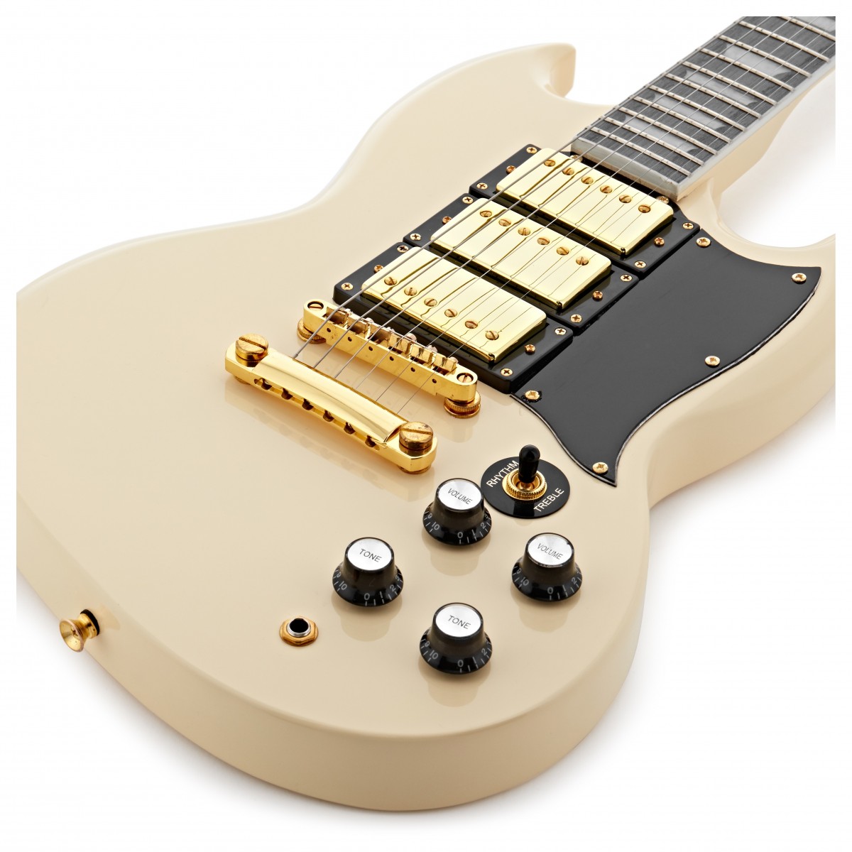 Brooklyn Select Elgitarr från Gear4music är som gjord för för rock. Det kraftfulla och omedelbart igenkännbara ljudet kommer med ett par täckta humbucking pickuper. Med en standard mahognykropp är Brooklyns naturligt organiska ton idealisk för både tunga riffs och själfulla solon medan den bekväma lönnhalsen ger en fantastisk stämningsstabilitet och en bitande närvaro i toppnoterna. Brooklyns ikoniska dubbla hornform möjliggör en oslagbar ergonomisk tillgång till de övre banden medan dess tunna form och välplacerade kontroller gör den mycket bekväm att spela. En robust väska och en kabel ingår i priset. Med en snygg glansig finish i elfenbensvit är Gear4music Brooklyn en prisvärd gitarr som är redo för scenen.