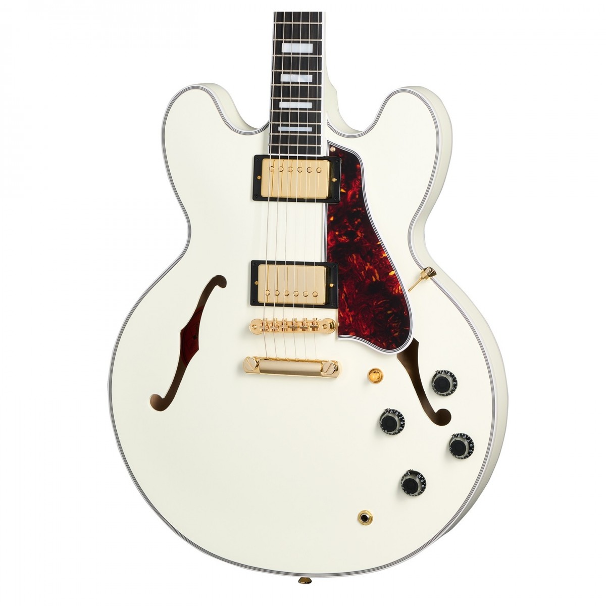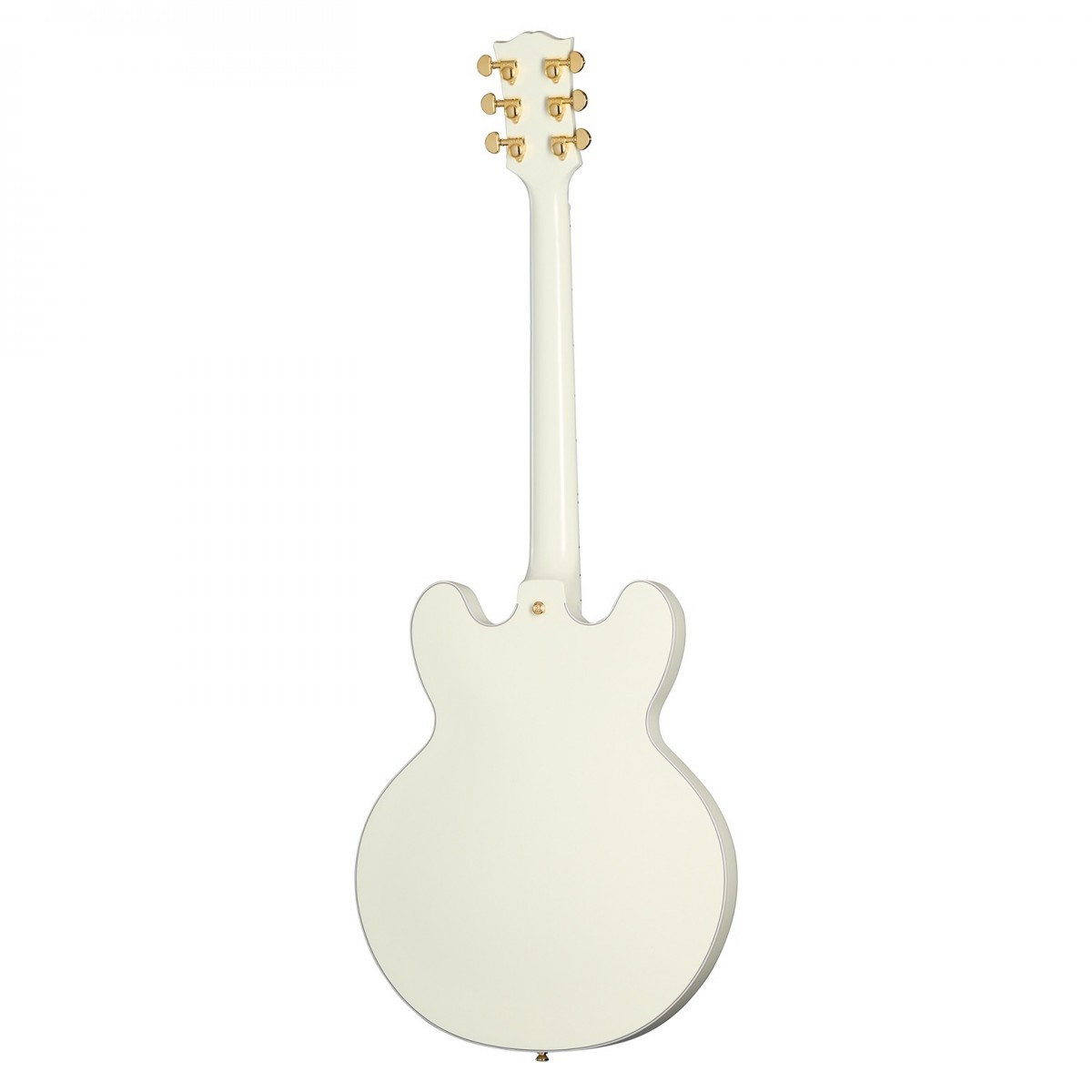 Epiphone 1959 ES-355 Inspired by Gibson Custom är en fantastisk återskapning som ger den lyxiga auran och exceptionella kvaliteten hos en av Gibson:s mest vördade modeller i händerna på dagens musiker. Denna modell återskapar de invecklade detaljerna och den sofistikerade estetiken hos 1959 års original ES-355 med en 5-lagers lagerkonstruktion i lönn/poplar med ett mittblock i massiv lönn för förbättrad sustain och minskad feedback. Den autentiska 50-talshalsens rundade Medium C-profil och den släta Ebenholts greppbrädan ger en bekväm spelbarhet och en varm fyllig ton. Utrustad med handkablade Gibson Custombuckers och förstklassiga kabeldragningskomponenter erbjuder denna gitarr en ljudrik upplevelse som troget återger de klassiska toner som har förtrollat musiker i årtionden. Gold Grover Rotomatic-stämskruvar en Tune-O-Matic -stall och en historisk reissue aluminium-stoppstång ger modern tillförlitlighet med vintage -charme. De detaljerade pärlemorinläggen och gold hårdvaran accentuerar inte bara dess visuella tilltal utan ekar också storheten i dess inspiration.