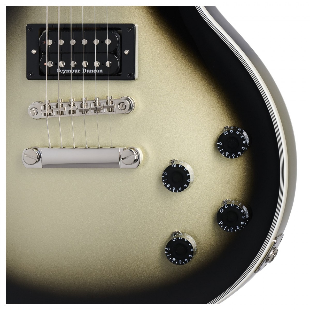 Epiphone Adam Jones 1979 Les Paul Custom är ett omsorgsfullt tillverkat instrument som är en hyllning till den ikoniska Tool-gitarristens uppskattade Gibson Les Paul från 1979. Den här gitarren är designad i samarbete med Gibson Custom och har en massiv mahognykropp med lönntopp i en iögonfallande antik Silverburst finish. Den distinkta tredelade halsen i lönn formad enligt Adam Jones specialspecifikationer och greppbrädan Ebenholts ger smidig spelbarhet och exakt artikulation. Utrustad med en Custombucker i halspositionen och en högpresterande Seymour Duncan Distortion i stallet levererar denna modell en kraftfull ljudpalett som passar för en mängd olika musikstilar. Hårdvaran inkluderar Epiphone:s LockTone Tune-O-Matic -stolpe och Stop Bar-stycke som arbetar tillsammans för att ge överlägsen intonation och sustain. Ytterligare skräddarsydda element som Gibson open-book Gitarrhuvud med exklusivt konstverk av Joyce Su och införandet av en unik två-tums konvex spegel i fodralet gör den här gitarren till en samlares dröm och en spelares glädje.
