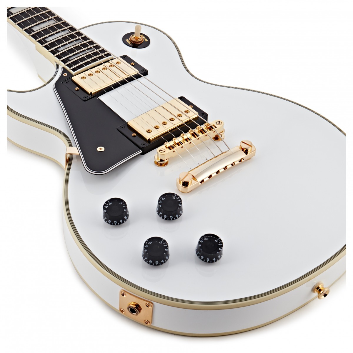 Specifikationer Produktkod: EILCLAWGH1 Kropp och stall Material: Mahogny Form: Les Paul Bindning: Multi-Ply Custom Finish: Blank Stall: Epiphone LockTone Tune-O-Matic Hals och greppbräda Halsmaterial: EPIUYZ684 Halsform: 60-tals SlimTaper Halskonstruktion: Halsad Skallängd: 2475 tum Greppbrädematerial: Ebenholts Greppbräderadie: 12 tum Band: 22 Medium Jumbo Inlägg: Pearloid Block Sadel: GraphTech Nubone Sadelbredd: 43 mm Hårdvara och elektronik Stallpickup: Epiphone ProBucker 3 Halspickup: Epiphone ProBucker 2 Kontroller: 2x volym 2x ton CTS-potentiometrar Pickupväljare: 3-vägs Epiphone Toggle Kontrollknappar: Svarta hastighetsknappar Switch Tips: Vit Hårdvarufinish: Guld Bakstycke: Epiphone LockTone Stop Bar Stämskruvar: Grover Rotomatic 18:1 Dragstång: Justerbar klockformad 2-lagers Les Paul Custom Remknappar: Guld Pickupskydd: Guld