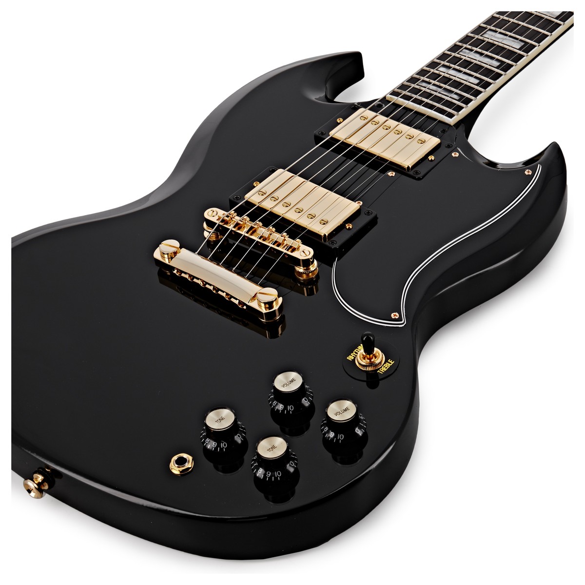 Original Hellraiser Aggressiv crunch. Snarlingbit. Vild ton. Det finns många saker som Epiphone SG Custom är känd för. Sedan starten på 1960-talet har denna mångsidiga yxa ändrat kursen för tung musik för gott. Nu är det tillbaka för att bygga vidare på sitt episka arv och ge framtiden för gitarrspelning den slagkraftighet den förtjänar. Autentiska hot pickups. Klassiskt vintage-ljud. Custom har sin skrämmande karaktär från två Alnico Custom PRO pickups. Gör dig redo att sätta elden i handen. Båda humbuckarna arbetar tillsammans för att ge dig en mångsidig tonpalett. Oavsett om du strimlar upp högt eller rivar ner lågt får du alltid en lyhörd bottenände släta glasartade toppar och tillräckligt med mellanslag för att sparka dig till trottoarkanten. Du är på väg att döda. Full tonstyrning för den mångsidiga gitarristen. Med trevägs pickupväljare ton och volymkrukor inbyggd har du alla verktyg du behöver för att slå det ultimata gitarrljudet. Oavsett om du älskar att lägga slickar eller föredrar att behålla rytmen har SG fått dig täckt. Gitarren som formade klassisk rock och metall En ikonisk design. SG var smidd från eld och svavel. Med sin signature dubbla spetsar skulle du ha misstag att tro att den här gitarren har djävulens horn. Men låt dig inte skrämmas av dess förödande utseende. Epiphone SG Custom är smidig att beröra passar tätt i dina händer med sina konturerade kurvor. Tillverkad av solid mahogny detta är en yxa som resonerar med full force från båda pickuparna. Gå från 0 – 100 på en smal avsmalnande hals som hjälper spelare att strimla ännu snabbare. Oavsett om du riffar högt eller chuggar ner lågt kommer du alltid att hitta det enkelt att spela dina riffs. Ingen belastning. Inget hårt arbete. Inga problem. SG är den ultimata partnern i brott för både rutinerade mördare och totala nybörjare. Varje anteckning är tillgänglig tack vare en 2475 ”skallängd och 12″ fingerboardradie. Men det är Ebenholts greppbräda som är SG: s verkliga hemliga vapen. Förutom en enkel spelbarhet resonerar detta imponerande tonved med krispigt underhåll. Rock and metal har precis fått en ny hjälte. Spela ditt bästa. Oavsett var du är Fantastisk ton är ingenting utan bra tuning. Med Epiphone SG Custom får du båda. Varje föreställning. Upptäck oklanderlig intonation från en Locktone ABR Tune-O-Matic-bro. Denna historic design kommer att få dina strängar att sjunga i tangent oavsett var du är. Oavsett om du spelar den lokala kretsen träffar vägen på din världsturné eller tränar hemma spelar du alltid ditt bästa. Pitch perfekt stabilitet. Varje steg på vägen. Gigging kan vara tufft så du behöver en gitarr som är upp till utmaningen. SG Custom levereras med Epiphone Deluxe maskinhuvuden vilket håller din tuning konstant. Strängfrågor? Inte med Epiphone SG. Upplev jämn kvalitet med Graph Tech-Sadeln. Det betyder inga plana fläckar inga döda strängar och inga tuning. Lägg till det ökade basresponset mitten och avancerade harmonierna så har du en ton som säkert kommer att vrida huvudet. Specifikationer Produkt: Epiphone SG Custom Ebenholts Kod: EISCEBGH1 Series : Anpassad Kropp Kroppsmaterial: mahogny Kroppsform: SG Färg: Svart Hals & Greppbräda Halsmaterial: mahogny Halsform : SlimTaper ™ Greppbrädans material: Ebenholts Greppbrädans radie: 12 ” Greppbrädans inlägg: Pearloid Block Antal band: 22 Bandstorlek: Medium Jumbo Sadel: Graph Tech Sadelbredd : 1693 ” Skallängd: 2475 ” Hardware och elektronik Hardware Finish : Gold Stämskruvar: Epiphone Deluxe med Ivory plastknapp Stall: LockTone ™ ABR Tune-O-Matic plektrumskydd: Svart Kontrollrattar: svarta topphattar med insatsvred Pickup-konfiguration: HH Stall Pickup: Alnico Custom PRO ™ Humbucker Hals Pickup : Alnico Custom PRO ™ Humbucker Kontroller: 2 volymer 2 toner 1 vippbrytare CTS elektronik Pickup-omkoppling: 3-vägs Epiphone växel Diverse Strängar: .10 .13 .17 .26 .36 .46 fodral: Valfritt