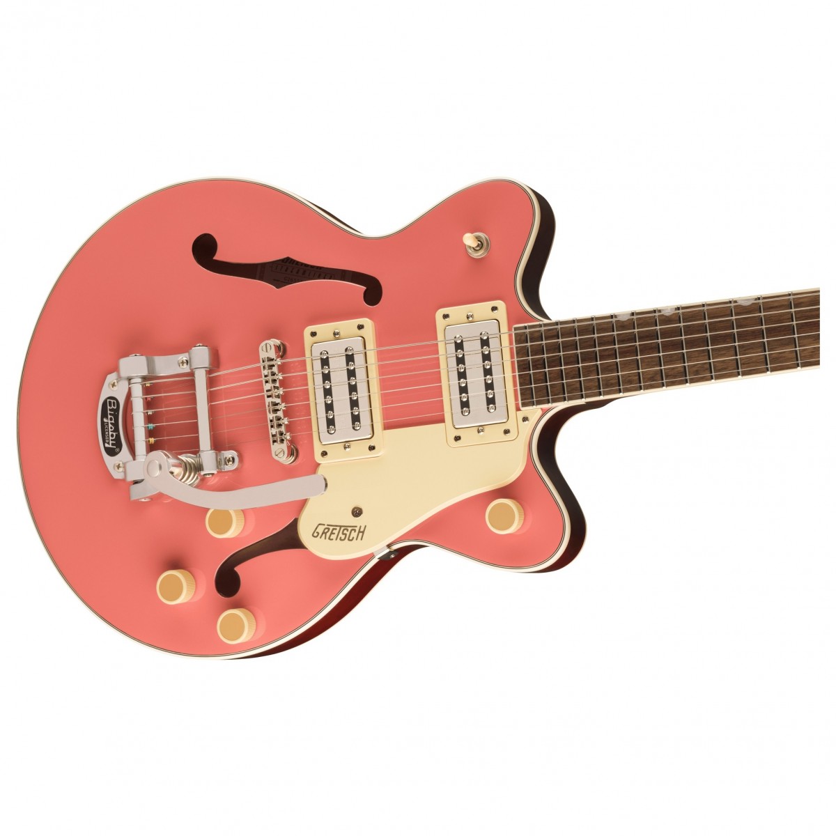 Nato hals med en glamourös finish G2655T är genialiskt utformad med en nato trähals vilket säkerställer en bekväm och smidig spelupplevelse. Den glansiga finishen ger halsen en elegant och välpolerad look vilket förstärker både den visuella dragningskraften och spelbarheten. Perfekt spelbarhet från mjuk ”C”-hals och mindre skala G2655T är utrustad med en mjuk ”C”-formad halsprofil som ger ett bekvämt grepp för ett brett utbud av spelstilar. Den nedsatta konstruktionen förbättrar sustain och resonans vilket leder till tydliga ringande toner. En något kortare skallängd på 2475″ säkerställer att den här gitarren känns mer spelbar och varje band känns inom räckhåll. Blank kropp i lönn G2655T har en laminerad lönnkropp med en glansig glans. Denna kombination lovar inte bara hållbarhet utan förstärker också gitarrens resonans och ton. Kroppsformen Streamliner Center Block Jr. ger en lätt men kraftfull spelupplevelse. Smidig kraftfull ton med Broad'Tron BT-3S-pickuper Utrustad med Broad'Tron BT-3S-pickuper levererar G2655T kraftfulla toner lämpliga för olika musikstilar. Kontrolllayouten inkluderar separata volymkontroller för varje pickup och en huvudtonkontroll. Huvudvolymkontrollen kommer med en push/pull-funktion för spoldelning vilket breddar ditt utbud av ljudmöjligheter. Specifikationer Kod: 2807200555 Kropp Kroppsmaterial: Laminerad lönn Kroppsfinish: Glans Kroppsform: Streamliner™ Center Block Jr. Body Top: välvd laminerad lönn Kroppsbindning: Åldrad vit med B/W/B Purfling Kroppsrygg: välvd laminerad lönn Kroppsstil: Gretsch ® Center Block-gitarrer Cutaway : Dubbel Cutaway Förstärkning: Mittblock Midja: 8625″ (21908 mm) Ljudhål: F-hål Hals & Greppbräda Gitarrhuvud-bindning: Åldrad vit Halsmaterial: Nato Halsfinish: Glans Halsform: Mjuk ”C” Halskonstruktion: Halsad Greppbrädans radie: 12″ (305 mm) Greppbräda Material: Laurel Positionsinlägg: Pearloid Neo-Classic™-miniatyr Sidopunkter: Svarta Antal band: 22 SträngSadel: Ben Sadelbredd: 16875″ (4286 mm) Sadelmaterial: Ben Hårdvara och elektronik Stall: Adjusto-Matic ™ Broskydd/Stjärtstycke: Bigsby ® B50 Bromontering: Förankrad Plektrumskydd: 1-lagers Cream med Gold Gretsch ® -logotyp Pickupskydd: Nickel Kontrollknappar: Gretsch ® Radioknopp Switch Tips: Cream Hårdvara Finish: Nickel Stämskruvar: gjutna förseglade Strängar: Nickelpläterat stål (.010-.046 mätare) Remknappar: Standard Strap Button Stall Pickup: Broad'Tron™ BT-3S Halsmikrofon : Broad'Tron™ BT-3S Pickup-konfiguration: Broad'Tron™ / Broad'Tron™ Kontroller: Volym 1. (Hals Pickup ) Volym 2. (Stall Pickup) Master Tone Master Volym med Push/Pull för Coil Split Växling: 3-Position Toggle: Position 1. Stall Pickup Position 2. Stall and Hals Pickup Position 3. Hals Pickup Hjälpomkoppling: Push/Pull Pot (för spoledelning)