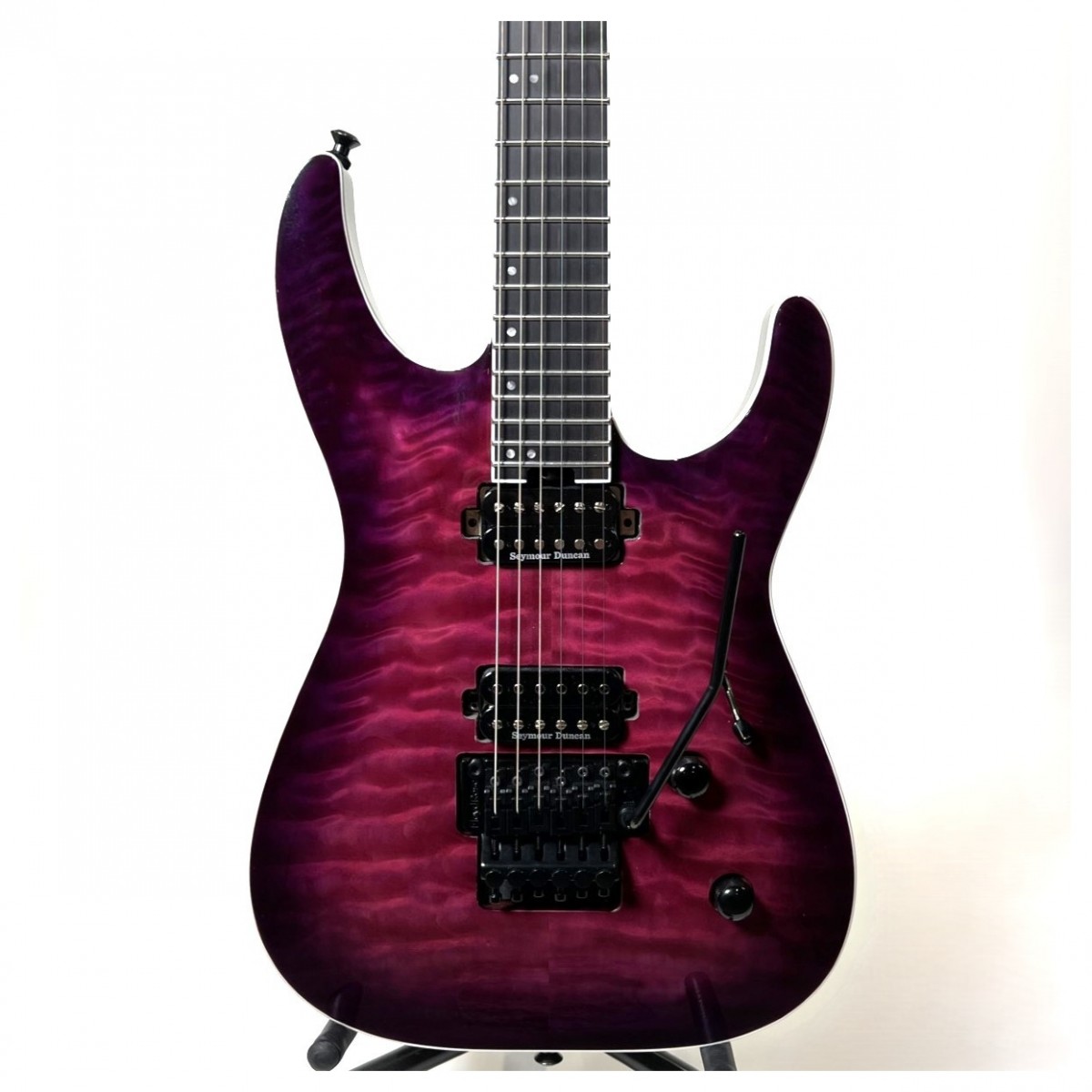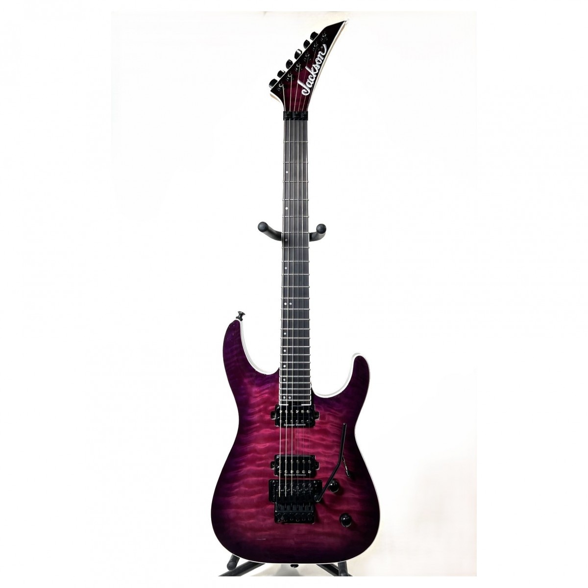 Femdelad bolt-on hals i lönn/valSadel med grafitförstärkning Den femdelade bolt-on-halsen i lönn/valSadel på Jackson Pro Plus Series Dinky DKAQ ger exceptionell stabilitet och hållbarhet. Halsen är förstärkt med grafit vilket minskar risken för skevhet och förbättrar instrumentets övergripande prestanda. Den skulpterade shredders cut-hälen ger enkel åtkomst till de högre banden vilket möjliggör sömlös spelbarhet över hela greppbrädan. 12″-16″ compound radius Ebenholts greppbräda med 24 Jumbo-band i rostfritt stål Greppbrädan Ebenholts med compound radius är en utmärkande egenskap hos den här gitarren. Med en compound-radie på 12″-16″ ger greppbrädan en bekväm spelyta som passar för både rytm- och leadspel. De 24 jumbobanden i rostfritt stål ger optimal intonation och hållbarhet vilket gör det enkelt att göra böjningar och spela smidigt. Hälmonterat hjul för justering av trussrod Jackson har utformat Pro Plus Series Dinky DKAQ med bekvämlighet i åtanke. Det hälmonterade Dragstång-justeringshjulet gör det enkelt att justera halsavlastningen vilket garanterar optimal spelbarhet hela tiden. Tack vare denna funktion behöver du inte ta bort gitarrens hals för att göra dessa justeringar vilket möjliggör snabbt och problemfritt underhåll. Direktmonterade Seymour Duncan humbucking-pickuper Jackson Pro Plus Series Dinky DKAQ är utrustad med direktmonterade Seymour Duncan JB TB-4 humbucking-mickar för stallet och Seymour Duncan 59 SH-1N humbucking-mickar för halsen. JB TB-4-pickupen ger ett kraftfullt och tungt ljud med utmärkt sustain och rika övertoner medan 59 SH-1N-pickupen ger varma och klara toner. Tillsammans ger dessa pickuper ett mångsidigt utbud av ljudmöjligheter vilket gör gitarren lämplig för olika genrer allt från country och blues till punk och metal. Floyd Rose 1000 Series Tremolostall med dubbel låsning Jackson Pro Plus Series Dinky DKAQ har ett Floyd Rose 1000 Series dubbellåsande tremolobryggsystem som möjliggör mjuka och exakta tremoloeffekter med bibehållen stämningsstabilitet. Detta bryggsystem säkerställer att även de mest aggressiva dive bombs och breda vibratoböjningar återför strängarna till tonhöjden på ett tillförlitligt sätt. Jackson låsbara bandknappar och förseglade stämskruvar i pressgjutning Pro Plus Series Dinky DKAQ är utrustad med låsbara remknappar Jackson vilket gör att du kan känna dig trygg under energiska framträdanden live. Dessa bandknappar säkrar ditt instrument förhindrar oavsiktlig lossning och ser till att gitarren hålls på plats. Dessutom är gitarren utrustad med förseglade stämskruvar i pressgjutning vilket ger exakt och stabil stämning så att du kan fokusera på att spela utan att behöva oroa dig för ständig omstämning. väska ingår För att skydda och transportera din Jackson Pro Plus Series Dinky DKAQ medföljer en väska vid köp. väskaen ger bekväm förvaring och tillförlitligt skydd så att ditt instrument förblir säkert under resor och förvaring. Specifikationer för DKAQ Kropp Modell: Jackson Pro Plus Series Dinky DKAQ Transparent Purple Burst Riktning: Högerhänt Färg: Ghost Burst Ursprungsland: Kina Kina Material i kroppen: Okoumé Kroppens ytbehandling: Glans Kroppsform: Dinky® Kroppens bindning: Vit Hals & greppbräda Material hals: 5-delad lönn/valSadel/ahorn/valSadel/ahorn Finish på halsen: Oljad Konstruktion av hals: Bolt-On med grafitförstärkning Huvudstycke: Jackson® Pointed 6-In-Line Bindning på topplock: Vit Material i greppbrädan: Ebenholts Greppbräda Radius: 12″-16″ Compound Radius (3048 mm till 4064 mm) Inlays: Offset pärlpläterad prick Sidopunkter: Luminlay® Antal band: 24 Band Storlek: Jumbo rostfritt stål Skalans längd: 255″ (6477 cm) Dragstång: Dubbelverkande med hjul för Sadeljustering Material Sadel: Floyd Rose® 1000 Series Låsning Sadelbredd: 16875″ (4286 mm) Sadel för trussstång: Justeringshjul för trussstång med hälmontering SträngSadel: Floyd Rose® 1000 Series Låsning Hårdvara och elektronik Bryggpickup: Seymour Duncan® JB™ TB-4 direktmonterad Halspickup: Seymour Duncan® 59™ SH-1N Pickupkonfiguration: HH Reglage: Volym ton Pickupomkopplare: 5-positions blad Positioner för pickupomkopplare: Position 1: Stallns pickup Position 2: Stallns yttre spole och halsens inre spole Position 3: Bryggpickup och halspickup Position 4: Halsens inre spole och stallns yttre spole Position 5: Hals-pickup Stall: Floyd Rose® 1000 Series Tremolo med dubbla lås (försänkt) Stämskruvar: Jackson® Sealed Die-Cast Finish på hårdvara: Svart Pickupkåpor: Svart Kontrollrattar: Dome Style Brytarspets: Svart Tremolo-arm: Floyd Rose® 1000 Series Låsning Strängar: Nickelpläterat stål (.009-.042 gauges) Remknappar: Dunlop® Dual-Locking Mätningar Mått: 440x1650x4510 IN Fraktvikt: 1200 LB
