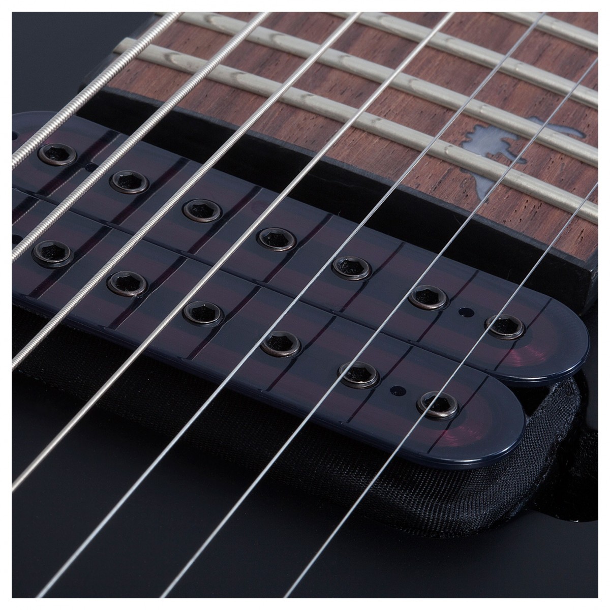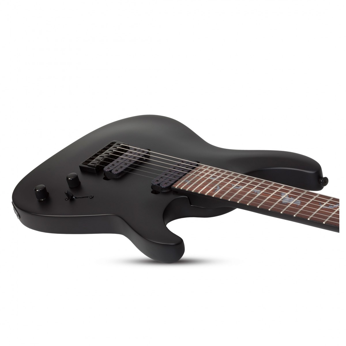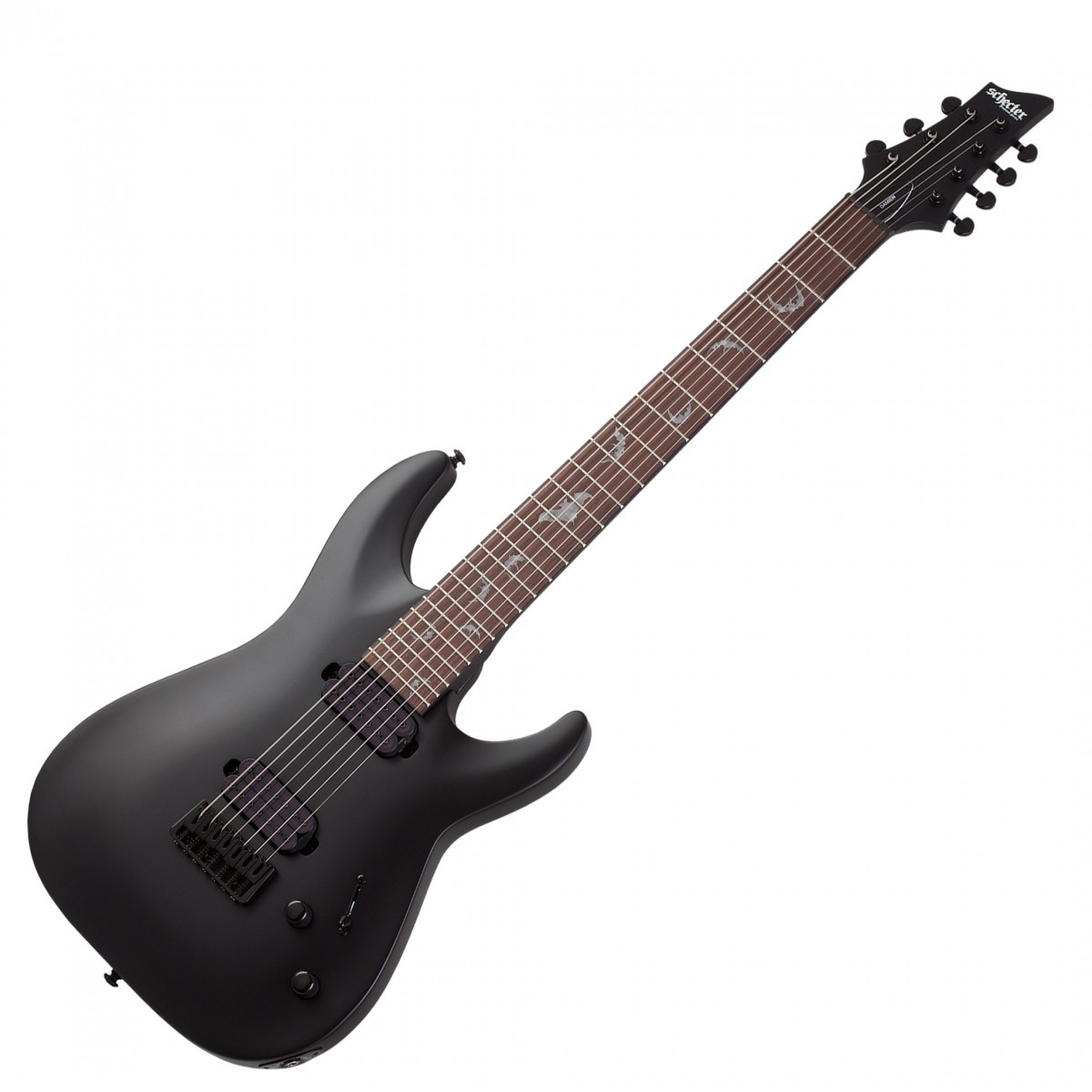 Riff med superstyrka. Från fylliga ackord till högflygande solon är denna gitarr gjord för metall. Schecter Damien-7 är en slående mångsidig elgitarr med avancerade funktioner och ett pris som kan överraska dig. Damien är byggd kring en sakkunnigt skuren mahognikropp och är utrustad med Schecters helt nya Diamond Heretic humbuckers. Den innovativa designen ger ett aggressivt ljud med maximal karaktär och push-pull-tonratten innebär att enkelspoliga ljudalternativ är nära till hands. Släpp lös din kreativitet. Damien-7 har en branschstandard Thin C lönnhals. Kombinerat med rosenträgreppbrädans 14″ radie ger de en snygg spelupplevelse – perfekt för flytande solon och tajta riff. Gitarrens Schecter custom hardtail-stall och Graph Tech XL-Sadel garanterar perfekt intonation och suverän sustain. Toppad med en Satin Black finish och de ökända Schecter Bat-inläggen har Damien en spotlight-klar look för att matcha gitarrens massiva ljud.