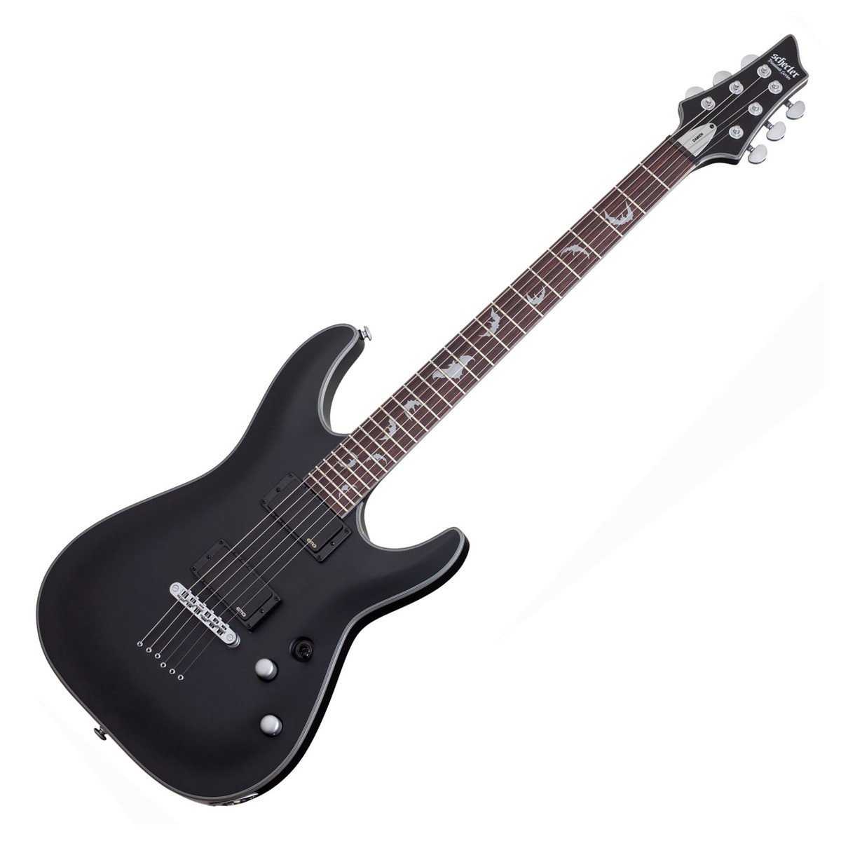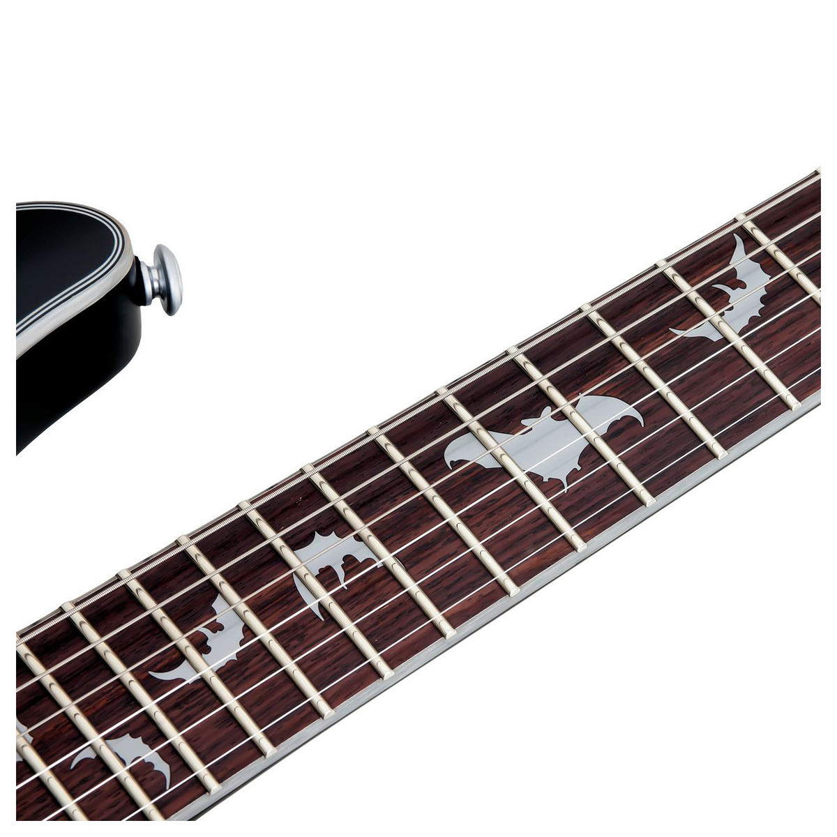 Schecter Damien Platinum-6 har en snidad mahogny kropp i en Sidenmatt Black finish. Elite utmärker sig i blandning mellan tunga och rena spelstilar och erbjuder en otroligt mångsidig gitarr. Schecter innehåller en rad imponerande efterbehandlingsfunktioner som aktiva EMG pickupar bultad hals med en rosewood fingerboard med platina bat inlägg och Grover maskinhuvuden.
