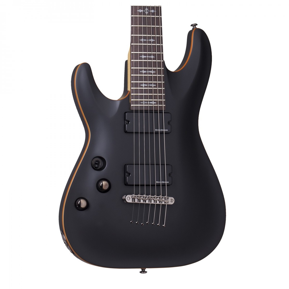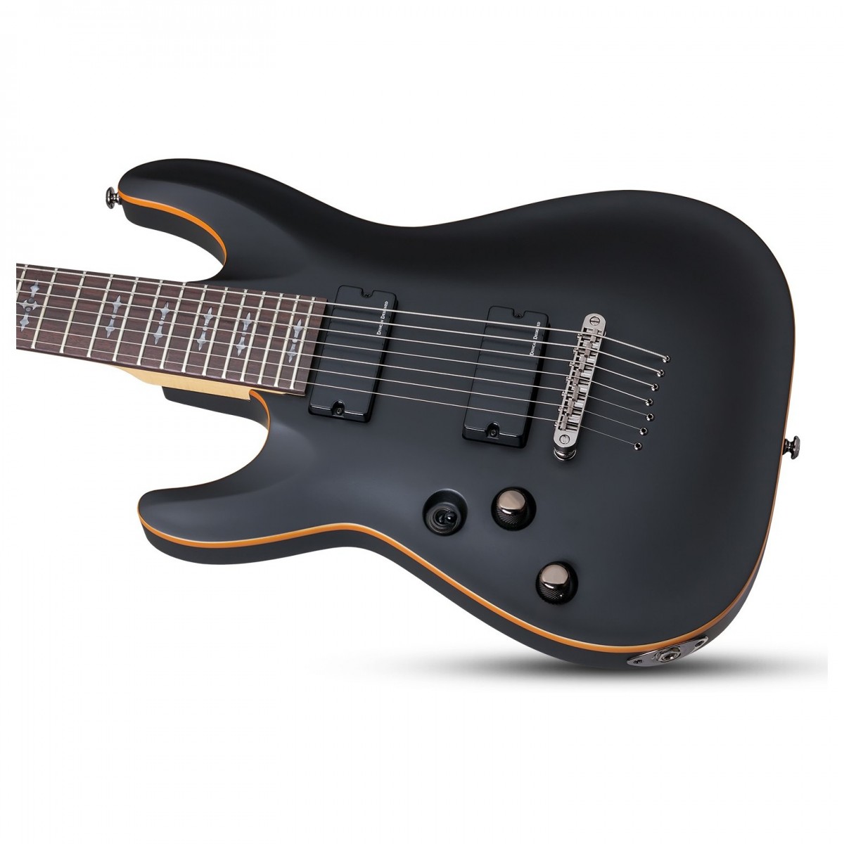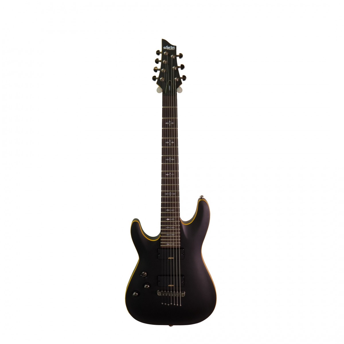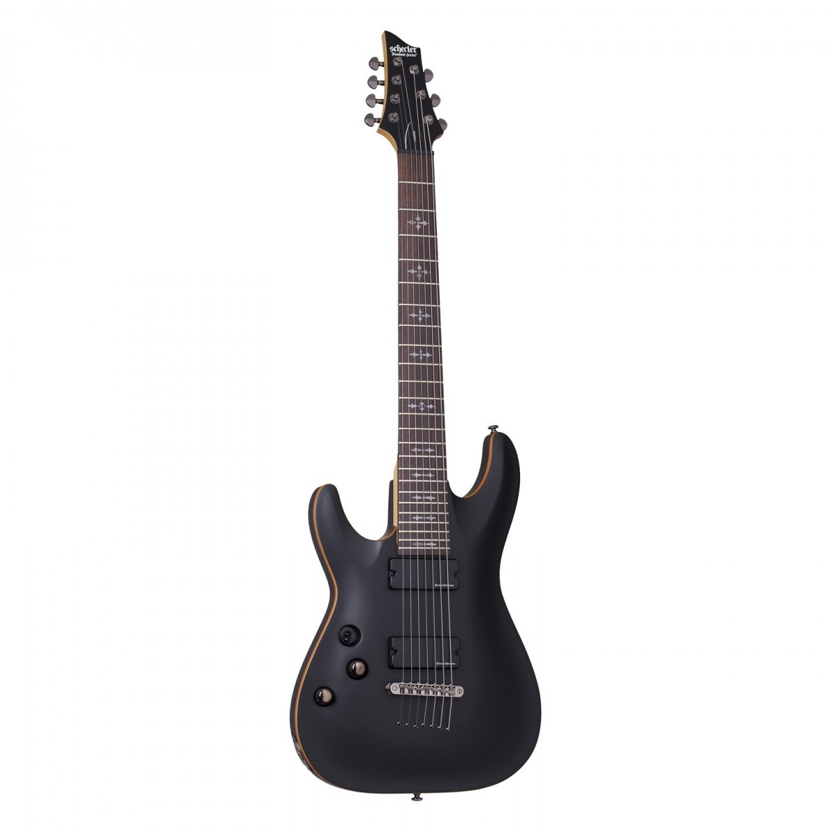 Funktioner Snygg black satin finish med högeffekt gul bindning 7 strängförlängt intervall – perfekt för utökat speluppspelning Seymour Duncan-designade HB-105 aktiv humbuckers 3-vägsbrytare och mastervolym / tonreglage Snabb spelhals: bred 14-tums radie 24 extra-jumbo band tunn C-profil Fast stall med sträng genom kropp för ökad stabilitet och resonans Graph Tech XL Black Tusq och Schecter stämskruvar Specifikationer Allmänt Modellnamn: Demon-7 LH Artikelnummer: 3483 Ursprungsland: Indonesien Gitarrfärg: Aged Black Satin (ABSN) Kropp Toppkontur: Välvd topp För: Vänsterhänt Konstruktion: Påskruvad Kroppsmaterial: Svartlind Bindning: Åldrig Crème 1-skikt Hals Greppbräda: Rosenträ Halsmaterial: Lönn Inlägg: Grey Pearloid Gothic Crosses Skala: 265 tum (673mm) Halsform: Tunn C Tjocklek: @ 1:a bandet – .787 tum (20mm) / @ 12:e bandet – .866 tum (22mm) Band: 24 X-Jumbo Greppbräderadie: 16 tum (406mm) Sadelbredd: 1889 tum (48mm) Dragstång: 2-vägs Justerbar Rod m/ 5/32 tum (4mm) Allen Sadel Hårdvara och elektronik Hårdvarufärg: Svart krom Knappar: Metall Knurled m/ Set Screw Sadel: Graf Tech XL Svart Tusq Stämskruvar: Schecter Stall: Schecter Custom Hardtail m/ String Through kropp Stallpickup: Duncan Designed HB-105 / 7B Halspickup: Duncan Designed HB-105 / 7N Kontroller: Volym / Ton / 3-vägsbrytare Batteri: 9-volts Inlopps-batteri Tillbehör Strängar: Ernie Ball Regular Slinky 7 # 2621 (.010-.056) Fodral: SGR-UNIVERSAL GUITAR fodral – ingår ej