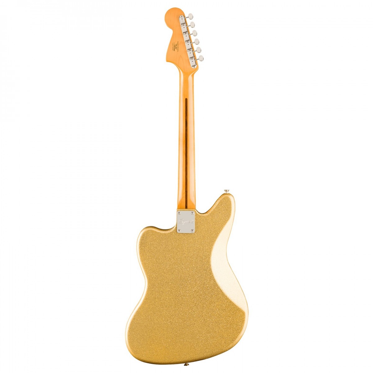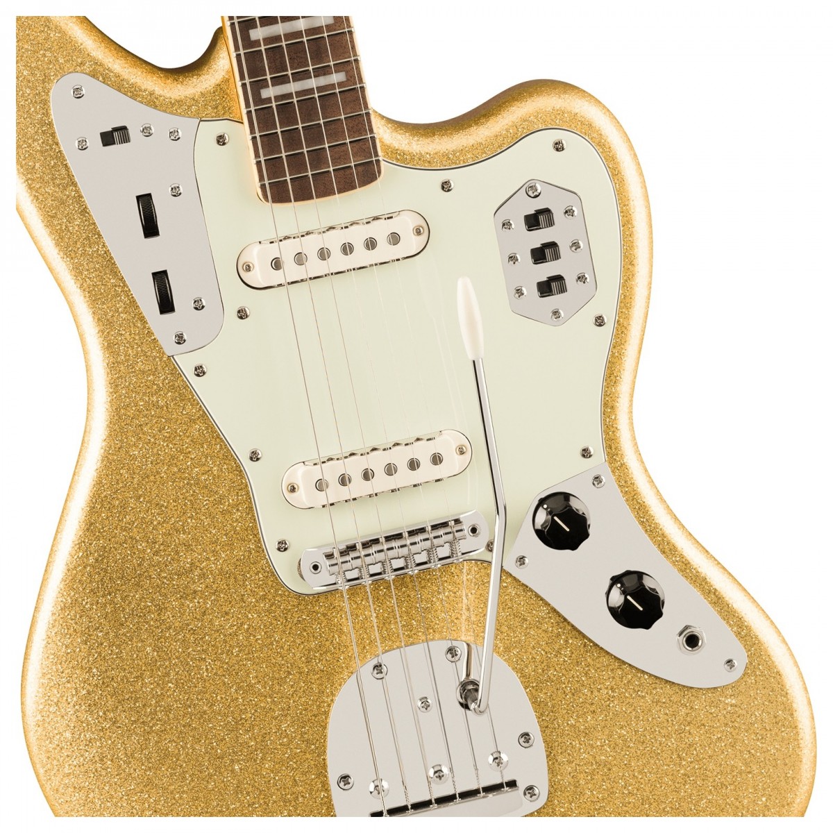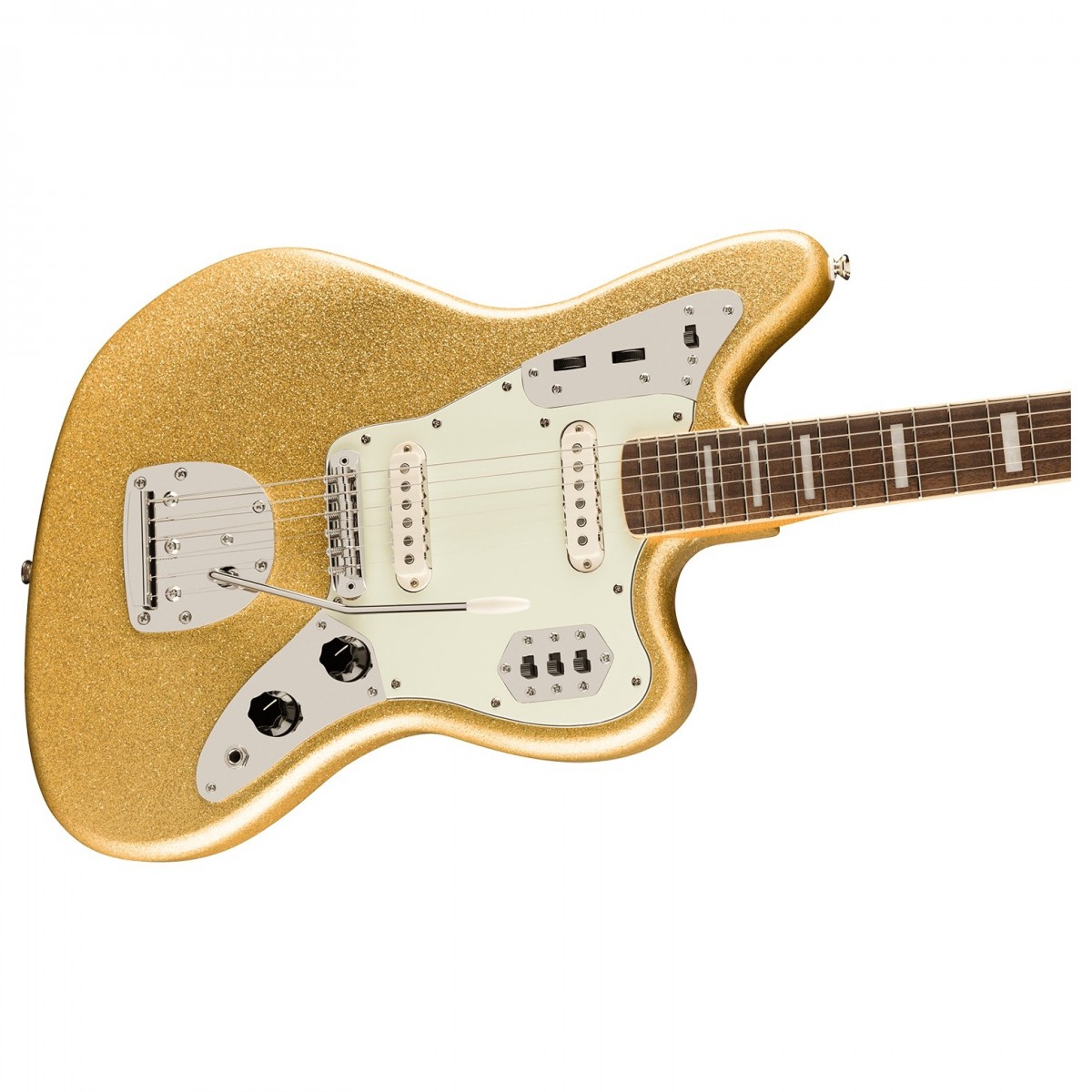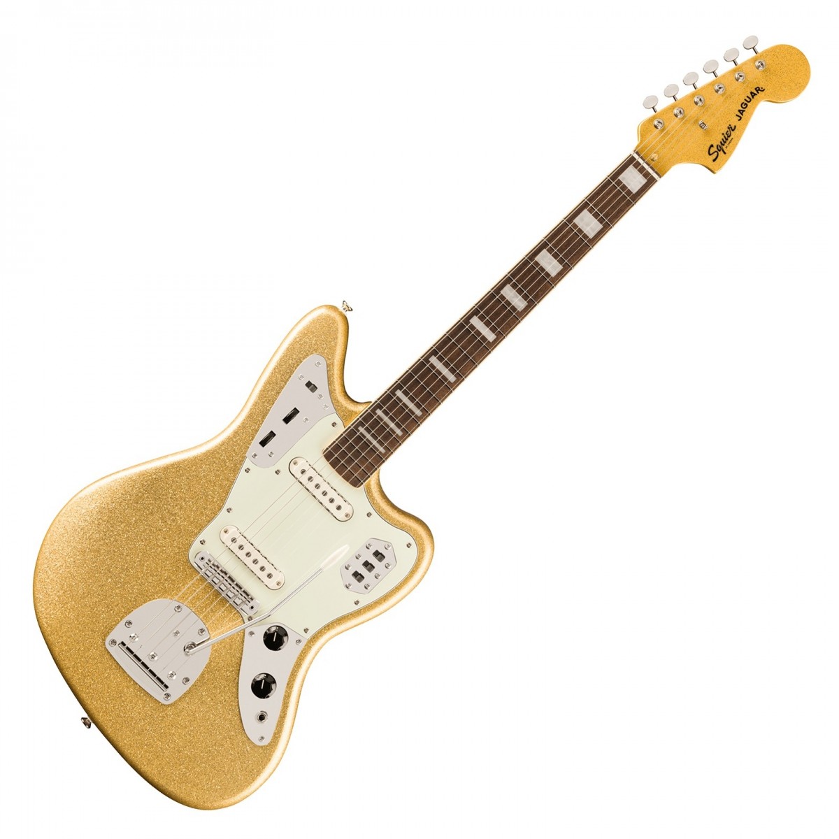 Squier FSR Classic Vibe 70s Jaguar Laurelgreppbräda är ett sant bevis på den nostalgiska eran som formade modern musik. Denna limited edition-gitarr är omsorgsfullt modellerad efter den ikoniska 70-talsdesignen och har den gnista och glans som gjorde eran legendarisk. Med sin iögonfallande Gold Sparkle finish och det tidsenliga emblemet på huvudstocken är detta instrument mer än en gitarr – det är ett stycke historia. Spelare kan förvänta sig ljud av överlägsen kvalitet tack vare de Fender-designade alnico enkelspoliga pickuperna som på ett autentiskt sätt fångar de ljusa och kraftfulla tonerna från förr. I kombination med en enkel spelbarhet tack vare den korta skalan och den smala C-formade halsen passar den här gitarren perfekt för spelare på alla nivåer. Oavsett om du är ute efter vintage-vibbarna eller bara letar efter ett pålitligt instrument med enastående stil kommer Squier FSR Classic Vibe 70s Jaguar garanterat att överträffa förväntningarna.