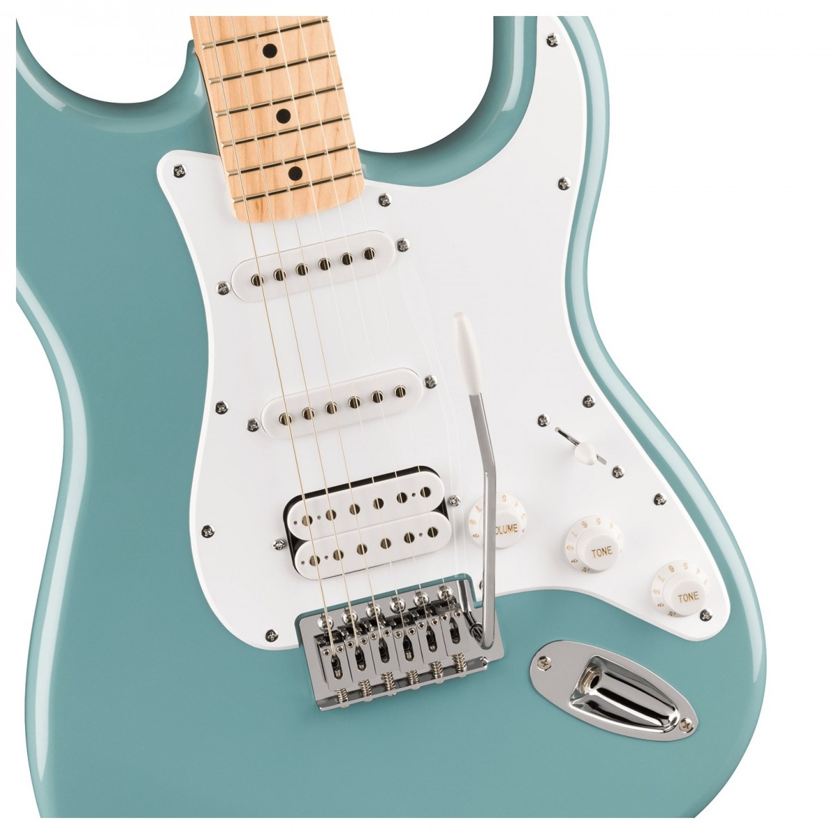 Sjungande Squier pickuper Kombinationen av en singular humbucker och två enstaka coils gör att denna Stratocaster glittrar i alla genrer och spelstilar. när de kombineras ger de en välbalanserad slagkraftig ton som ger dina toner klarhet och definition. Bryggpickupen är en keramisk humbucker som ger ett starkt ljud och en fyllig ton vilket ger kraft åt din musik. Mellan- och halspickupen är enstaka coils vilket garanterar att dina toner får en skarp och ren klarhet som sjunger uttrycksfullt. Vill du forma ditt ljud? På den här modellen finns volym- och tonkontroller samt en 5-vägs pickupväljare. Växla mellan humbuckers och enstaka coils för att hitta ditt önskade ljud som kan formas ytterligare med hjälp av två olika kontroller. Med den första tonkontrollen kan du justera mellan- och halspickupen medan du med den andra kan fokusera på humbucker. Prova nya stilar för att hitta den perfekta för ditt framträdande. Den perfekta kombinationen av olika träslag HSS-konfigurationen av pickuper ger denna Squier dess övergripande ton. Materialen spelar dock också en roll i ljudet genom att leverera vackra övertoner. Kroppen är tillverkad av poppel vilket säkerställer att din ton är väl avrundad och artikulerad medan halsen och greppbrädan i lönn ger ljusa och transparenta övertoner. Naturlig känsla för prestanda Stratocaster har noggrant utformats för att ge en lyxig spelupplevelse. Kroppen har en glansig polyuretanfinish som gör att din arm enkelt glider över kroppen vid varje stränganslag. Inte ens den svettigaste av föreställningar kan stoppa dina smidiga övergångar. Halsen har en elegant Sidenmattfinish som gör att din hand lätt glider över greppbrädan. Specifikationer Produktkod: 0373202548Kropp och stall Material: Poplar Form: Stratocaster Finish: Glansig polyuretan färg: Sonic Grey Bro: 6-sadel Vintage Style Synkroniserad Tremolo med block sadlarHals och greppbräda Material hals: Lönn Halsens form: C Halsfinish: Sidenmatt Urethane Halsens konstruktion: 4-bult Squier Material greppbräda: Lönn Greppbrädans radie: 95″ Band: 21 Narrow Tall Inläggningar svart prick Sadel: Syntetisk ben Sadelbredd: 42 mmHårdvara och elektronik Pickup vid stalln: Keramisk Humbucker Pickup i mitten: Keramisk enstaka-coil Hals pickup: Keramisk enstaka-coil Pickup-konfiguration: HSS Reglage: Master Volume Tone1 (Neck/Middle) Tone 2 (Stall) 5-vägs pickup-omkopplare Kontrollrattar: Vit plast Hårdvara: Krom Plektrumskydd: 1-lagers vit Stämskruvar: Gjutna förseglade Dragstång: Huvudjustering Strängar: Nickelpläterat stål (.009-.042 Gauges)