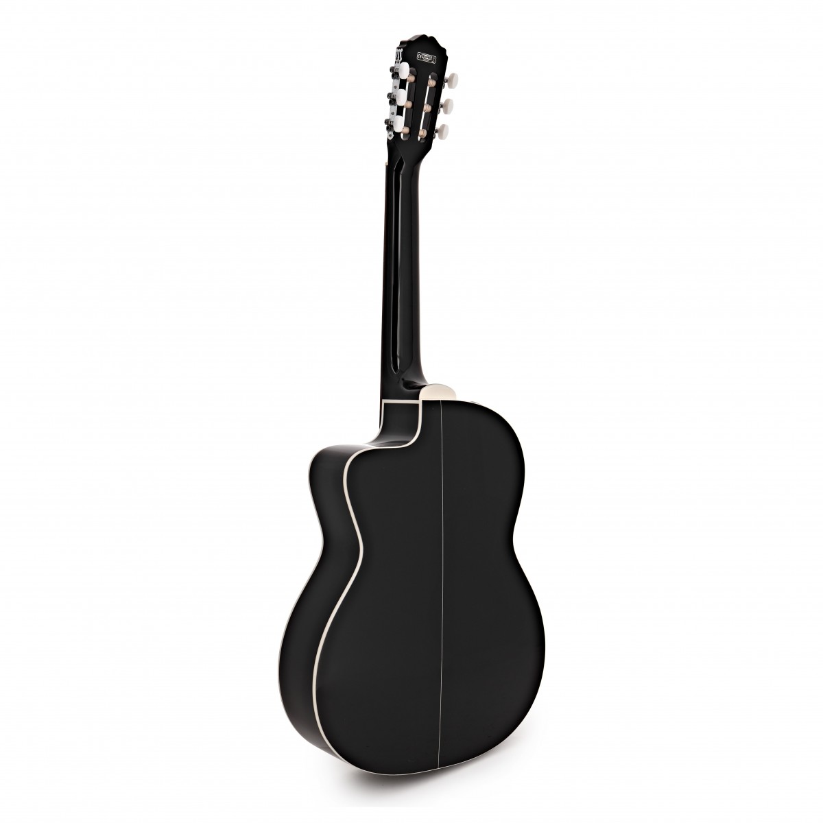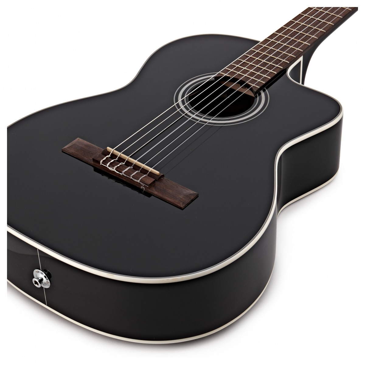 Glorious klassiskt ljud Denna sublima klassiska gitarr använder gran och alla dess fantastiska ljudfunktioner. Gran används för kroppstoppen och levererar glittrande artikulation med superb dynamik över hela frekvensområdet vilket ger dig den mångsidighet du behöver. Du kommer då att ha de varma resonanta tonerna av mahogny bak och sidor som bär varje ton. Känd för sitt betonade mellanslag erbjuder mahogny ett briljant balanserat ljud som passar i stort sett vilken genre som helst och kommer att trivas med klassiskt spel. När du vill ge din sublima nylonton lite känsla gör det med den typ av trogen respons som inte offrar den naturliga godheten hos gran och mahogny. Det är precis vad Takamine TP-E-elektronik ger. Skärpa ditt ljud med precision via förförstärkaren och låt sedan pickupen göra jobbet och projicera ditt gnistrande ljud långt och brett. Underskattad skönhet Med sin slående svarta finish silkeslen slät greppbräda i rosenträ och en mönstrad ljudhålsrosett är GC2CE både minimalistisk och elegant. Så som en klassisk gitarr ska vara. Dess skönhet ligger i tonwoodduon och de små detaljerna som ger den den sista finesser. Takamine från Takamine -inlägget till den svarta bindningen med vit purfling från de pearl Vit tunersna till svanshalsens halsfog har allt noggrant utformats för att erbjuda en himmelsk estetisk och enkel spelbarhet. Specifikationer Produktkod: TK-GC2CE-BLK Kropp & bro Topp: Massiv gran Rygg: Mahogny Sidor: mahogny Form: Klassisk Cutaway Finish: Svart Hals & greppbräda Hals: Mahogny Greppbräda: Rosenträ Sadelbredd: 508 mm Band: 21 Halsfog: 14: e band Elektronik och Hardware Elektronik: Takamine TP-E Preamp Kontroller: Tone Volume Tuner Mid Cut Tuner: Ja Inlägg: Sidopunkter Rosett: Mönstrad Maskinhuvudfinish: Pearl Vit Bindning: Svart med vit purfling plektrumskydd: Ingen