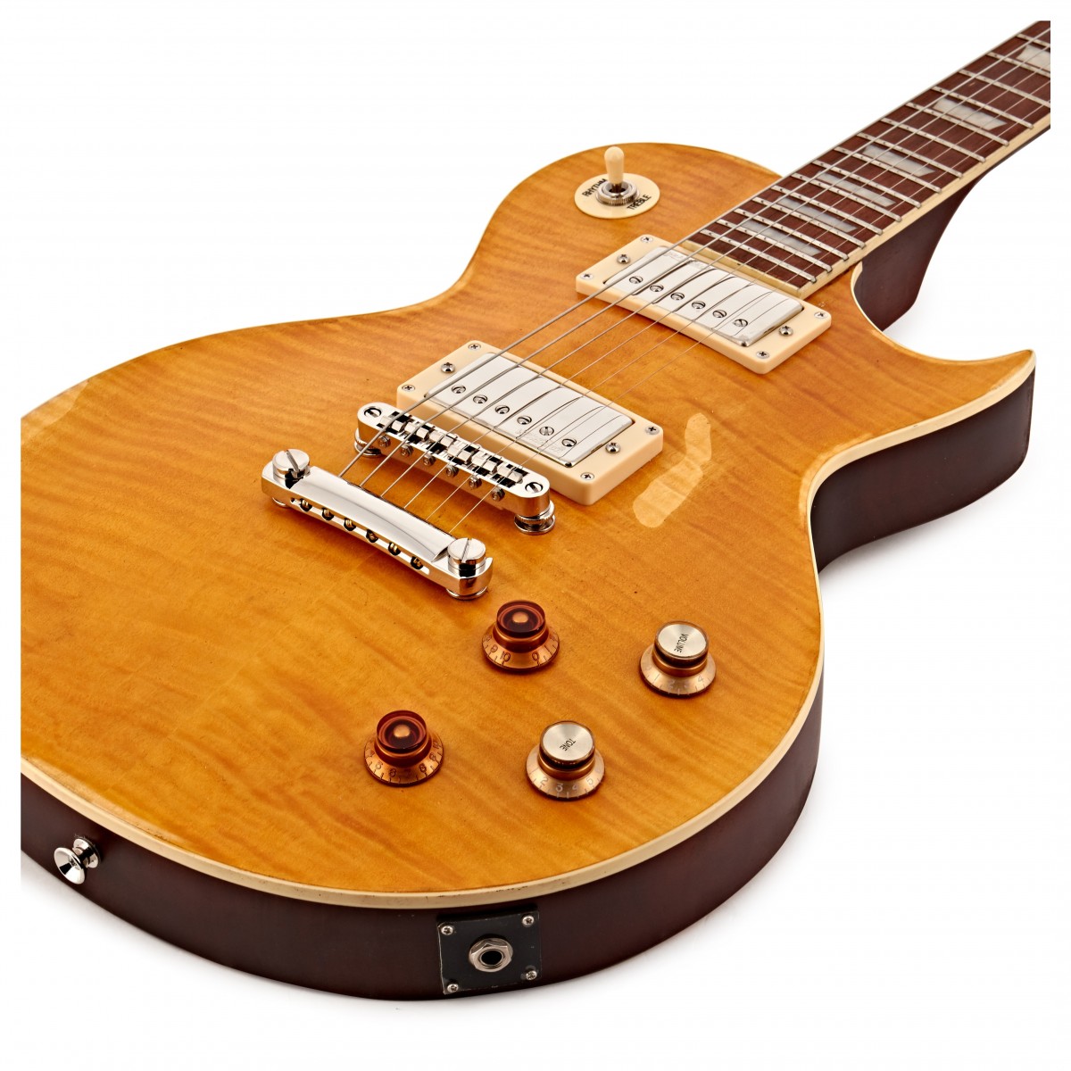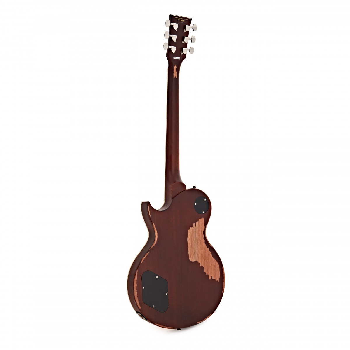 Klagande Wilkinson humbuckers Full av djärvhet. Wilkinson Double Coil WVC-mickarna på denna orörda gitarr har den omisskännliga krispiga rösten som ringer ut med övertygelse. Stall humbucker erbjuder hög effekt hög oktaneffekt som ger varje ton bit och närvaro. Dina ackord klingar med karaktär och dina slickar slagkraftighet igenom mixen utan problem. Halsen humbucker är också en riktig artist. Det kommer att ge dina kabelslickar den klassiska mättnaden som får dem att klaga av känslor. Den bestående hållaren får dig att böja noter oändligt och de kommer att skrika genom mixen. Med dessa två pickups i din arsenal kommer du att ha lätt att skapa inspirerad musik. Perfekta ditt spelande Som en vind. Det är lätt för dina fingrar att glida längs den mjuka lignum-rosa greppbrädan vilket hjälper dig att spela med total noggrannhet. Mahogny-halsen är också extremt lätt att spela – du kommer att kunna ändra bandpositioner med självförtroende. Den släta ytan och den bekväma ”mjuka C” -profilen gör den perfekt för ensamstående för att inte tala om cutaway kroppsform för utmärkt övre bandåtkomst. Den förskjutna hälen förbättrar också åtkomst till de övre banden massivt. Med denna skönhet i dina händer hindrar ingenting dig att skapa den musik du vill göra. Tät inställningsstabilitet Så du vill spela live? Inga problem. hårdvara på V100MR- icon lyser med kvalitet. En Wilkinson Tune-O-Matic håller din inställning stadig hela tiden medan Wilkinson Deluxe-tuners också håller dina strängar väl och riktigt låsta. En unik vacker finish i kombination med en robust robust konstruktion ger denna gitarr allt den behöver för att göra intryck. Omfamna din vintage vibes . Recensioner Guitar Tricks Insider Magazine ” Äntligen får en av de mest underskattade bluesgitarristarna genom tiderna lite respekt. Tack vare Vintage-gitarrer har äntligen en försenad hyllning till Peter Greens gitarrtrollkarl manifesterat sig. V100 är en av de mest olika … gitarrerna på marknaden idag och när det gäller hyllning av gitarrer är detta den verkliga affären. Med ett rökande hett källarpris som kommer att få avundsjuka Peter Green-fans att sikla tills de får tag på det här priset är jag säker på att musikbutikerna inte kommer att kunna ha dem i lager. ” Läs hela Guitar Tricks Insider Review Specifikationer Kropp Series : V100 Kroppsmaterial: Massiv mahogny Toppmaterial: Lönnkeps Konstruktion: Limmad hals Hals och greppbräda Halsmaterial: mahogny Sadelbredd: 425 mm Greppbrädans material: Lignum Rosa Inlägg: Pearloid Crown Banden: 22 Skallängd: 2475 tum / 628 mm Greppbrädans radie: 12 '' Hardware och elektronik Konfiguration: HH Hals Pickup : Wilkinson ® WVVZ dubbel spole (omvänd monterad) Stall Pickup: Wilkinson ® WVVZ Double Coil Kontroller: 2 volym / 2 ton / 3-vägs vippomkopplare Växling: 3-vägs pickupväljare (hals / hals + bro / bro) Stall: Tune-O-Matic Maskinhuvuden: Wilkinson ® Deluxe WJ01 Sadel: Vit grafit Skraplatta: 4-skikt svart Hardware Finish: Chrome Extra Vikt: 56 kg (varierar)