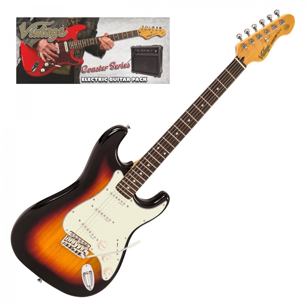 Vintage V60 Coaster Series Pack är det perfekta sättet att komma igång med elgitarr. Den innehåller en förstärkare pick väska och naturligtvis ett välgjort instrument med suveränt ljud som alla gitarrist från aspirerande till proffs kommer att ha lätt att spela på. Trion av enstaka coil pickuper erbjuder ett skarpt kraftfullt ljud som är perfekt för alla möjliga genrer – speciellt blues rock och indie. Designad av den legendariske gitarrbyggaren Alan Entwistle du kan vara säker på att de kommer att uppträda. Och så finns det tremolosystemet av hög kvalitet som låter dig ”wobbla” toner och ackord med whammy-stången – perfekt för att lägga till vibrato i farten. Denna klassiska gitarr kommer garanterat att hjälpa dig att bygga solida grunder som gitarrist – den spelar vackert. Alla medföljande tillbehör ser till att du har allt du behöver för att börja spela direkt.
